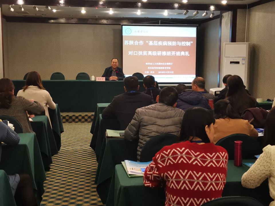 2019年11月11日,受陕西省人力资源和社会保障厅专业技术管理处委托,由best365足球官网承办的苏陕合作对口扶贫项目“基层疾病预防与控制”高级研修班(第一期)在西安骊苑大酒店举行开班典礼。