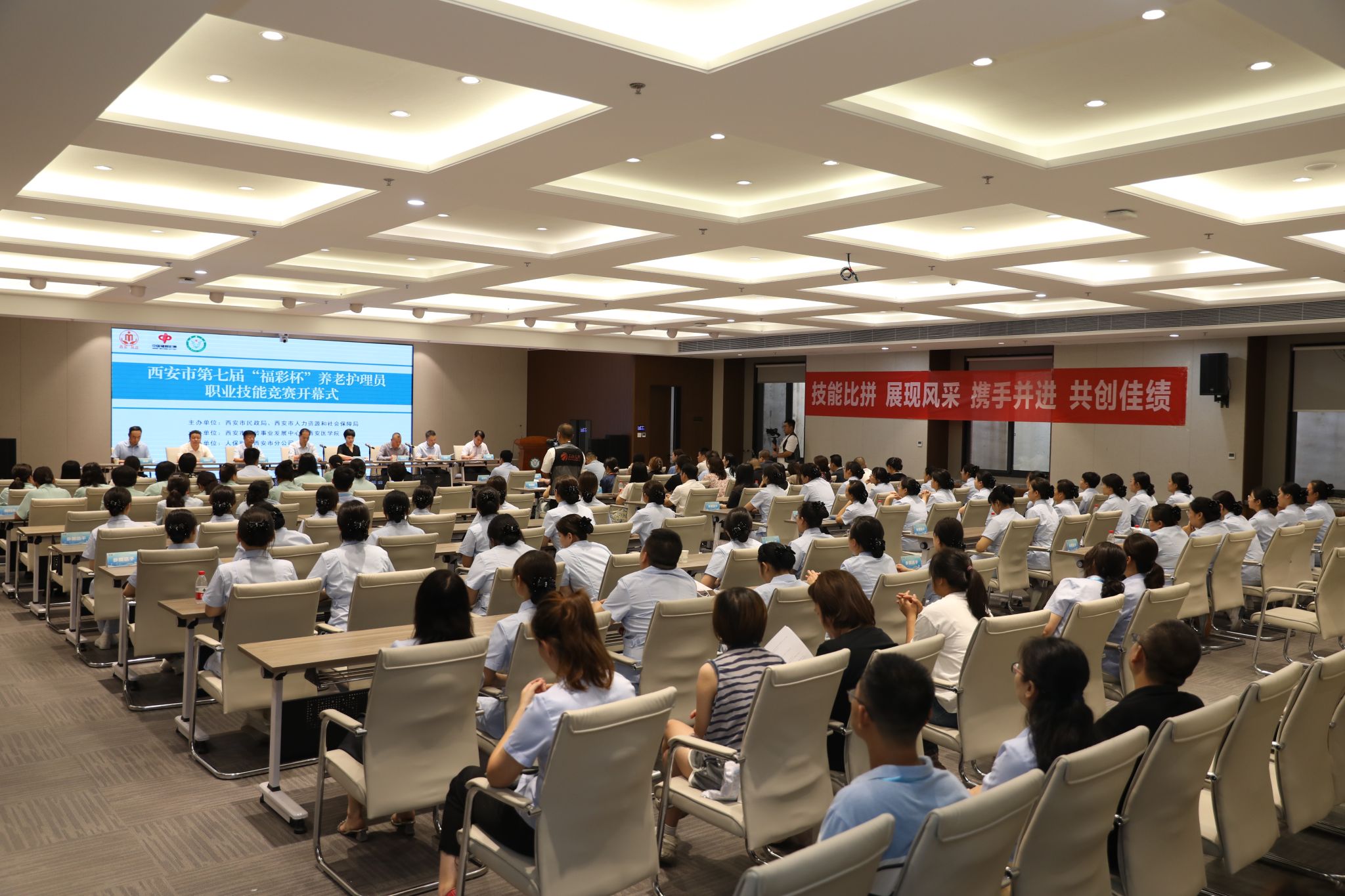 西安市民政局、西安市人力资源和社会保障局相关处室,人保财险西安市分公司,各区县、开发区民政局养老科,西安市第一、第二社会福利院,竞赛裁判员、参赛选手及公司工作人员等200余人参加开幕式。
