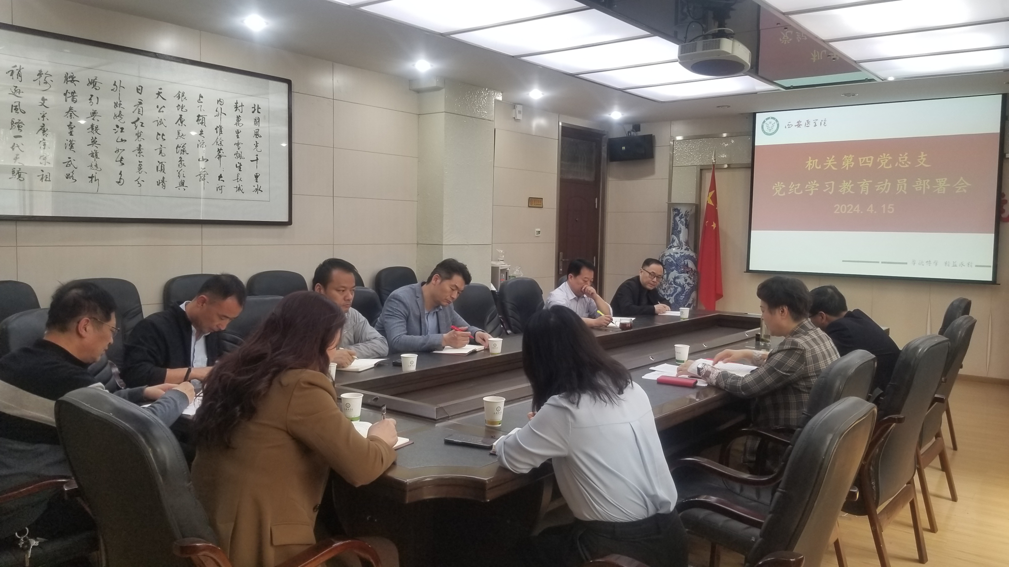 4月15日,机关四总支在高新校区会议室召开党纪学习教育动员部署会,旨在深入贯彻落实中省、公司关于党纪学习教育部署会议精神,会议由机关四总支书记靳红樱主持,机关四总支全体委员及各党支部委员参加会议。